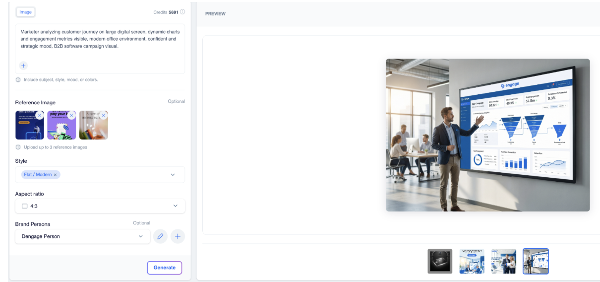 A marketing team preparing a campaign banner can instantly generate multiple visual alternatives by describing the product, campaign theme, and preferred style. Instead of waiting for design revisions, they can refine the visual with prompt-based edits, test variations, and finalize the most suitable version within minutes. The approved asset is then saved to the Image Library and used directly in email, push, or in-app campaigns.