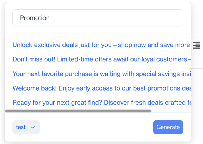 By selecting a target audience, you guide the AI on how to shape the language, level of detail, tone, and messaging approach. This ensures that generated content feels relevant and appropriate for different user groups, such as new users, loyal customers, mobile-first audiences, or premium segments.