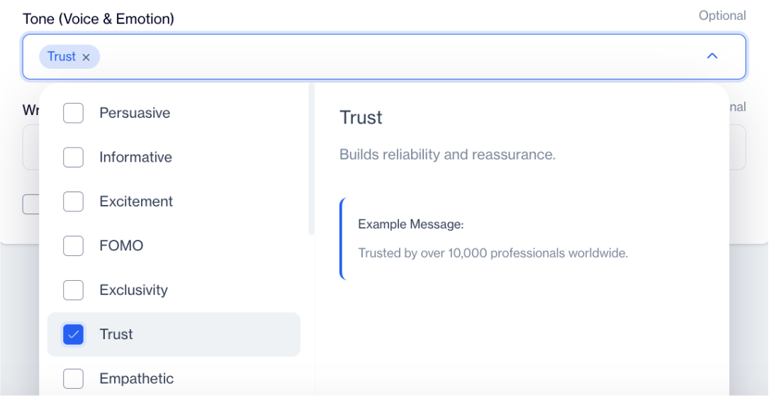 The Tone setting defines the emotional style and voice the AI should use when generating content. Selecting a tone helps ensure that messages feel appropriate for your brand’s intent, whether you want to inform, motivate, reassure, or excite your audience.