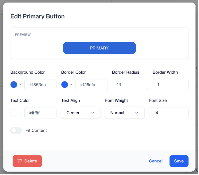 For each button type, you can customize various button properties such as color, size, and other visual attributes to match your brand’s style.