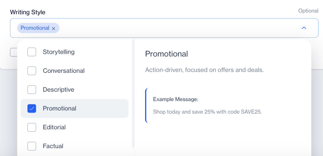 By selecting a writing style, you guide the AI on whether content should feel more narrative-driven, conversational, concise, informational, or action-oriented. This helps ensure that the format and delivery of messages align with your campaign goals and brand communication approach.
