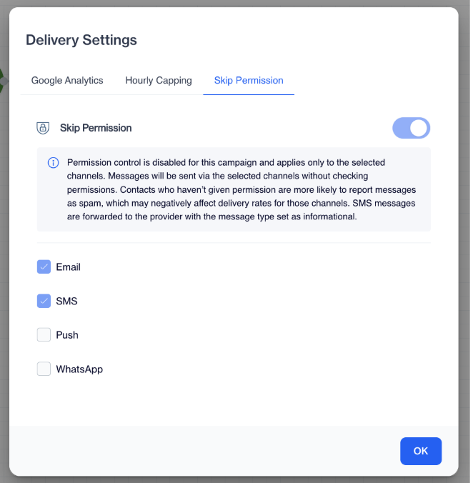 To use Skip Permission, open your campaign and go to the delivery settings section. Turn on the Skip Permission toggle to enable the feature at the campaign level.