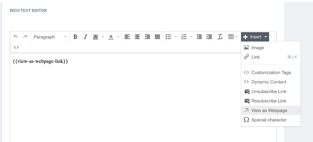 When the email is sent, this placeholder is automatically replaced with a working View as Webpage link.