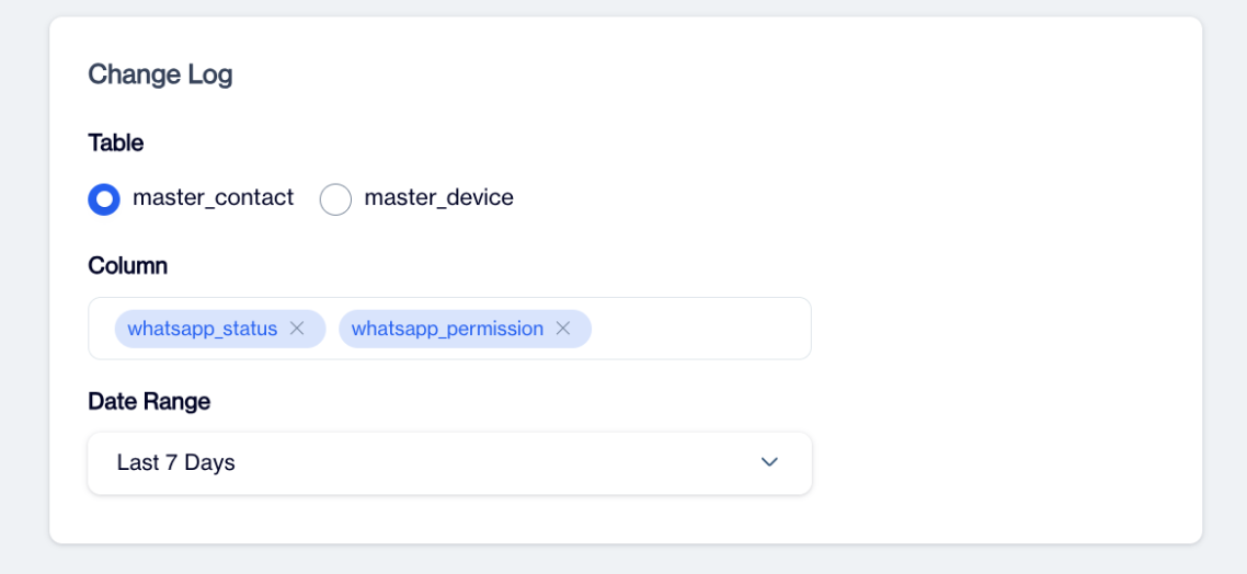 On the Change Log screen, you need to select the relevant table, either master_contact or master_device, depending on where your WhatsApp permission data is stored. After selecting the table, include the WhatsApp-related columns such as whatsapp_status and whatsapp_permission to capture unsubscribe and permission updates.