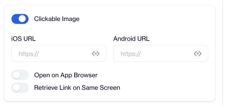 After enabling the Clickable Image toggle, additional configuration fields become visible. You can enter separate destination URLs for iOS and Android platforms. You can also choose whether the link opens in the app browser and whether the link should be retrieved on the same screen.