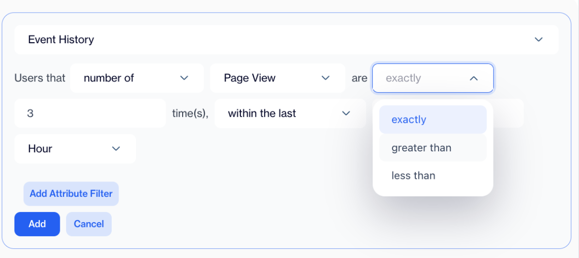 The Event History filter allows you to define conditions based on how many times a user performed a specific event (such as viewed a product or added an item to the cart) within a defined time period.