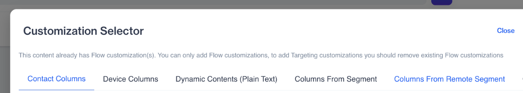 In the editor, click the Add Customization icon. This action opens the Customization Modal, where the columns received from the saved remote segment are listed and can be inserted as dynamic variables into your content. Any changes made to the segment and saved will be automatically reflected in the Customization Modal.