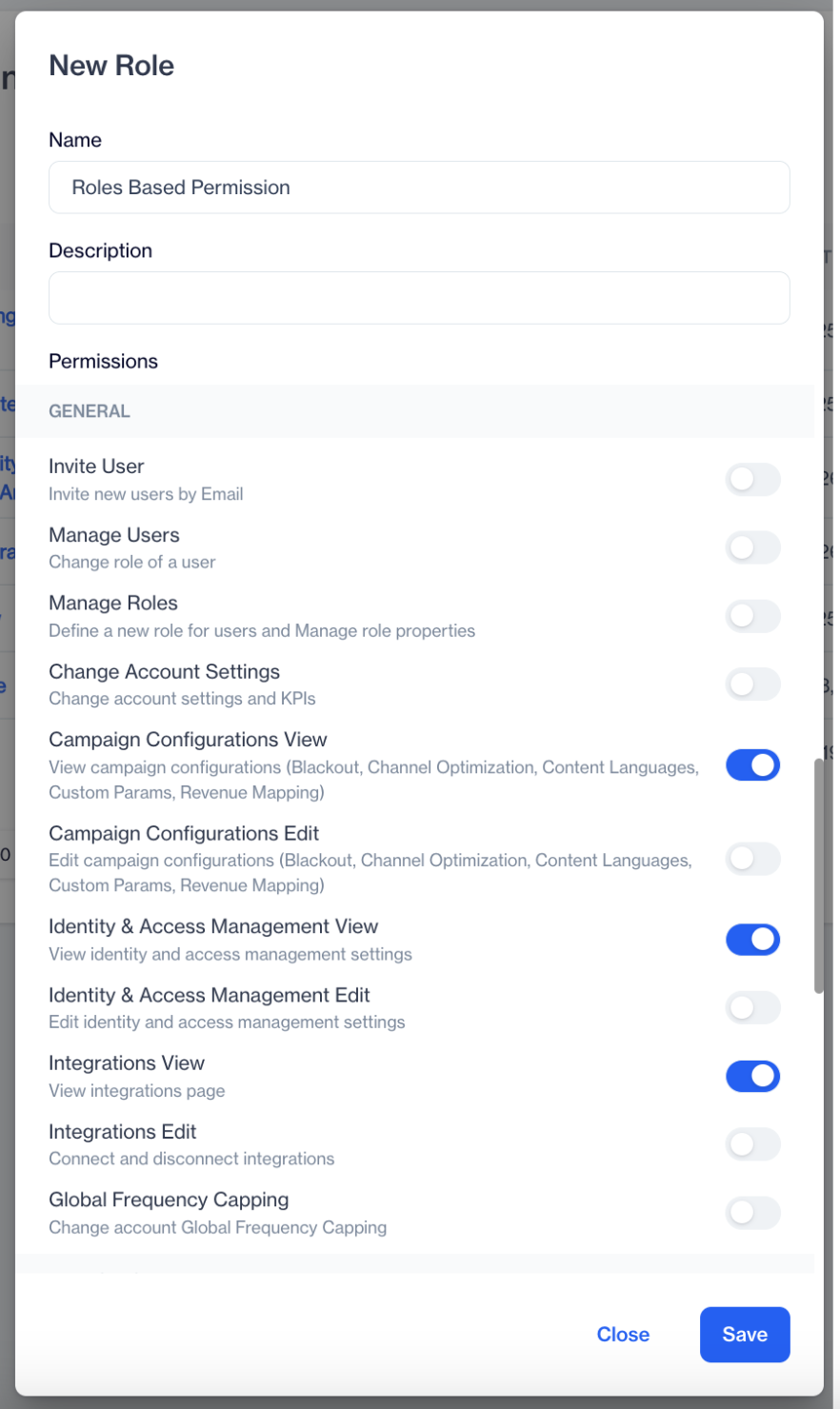 In this case, you can enable Campaign Configurations View so they can review settings like Blackout periods or Channel Optimization rules, while keeping Campaign Configurations Edit, Integrations Edit, and Change Account Settings disabled. This ensures they can monitor and plan campaigns confidently without risking accidental configuration changes.