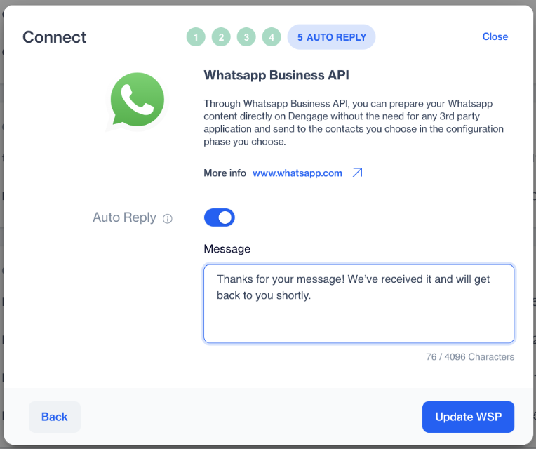 In the Auto Reply tab, enable the auto-reply toggle. Enter your message content and click Update WSP to save your configuration.