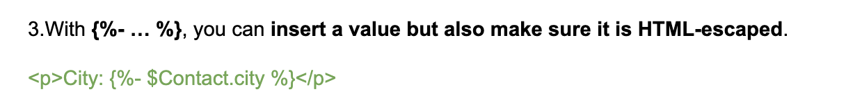 If the contact’s city is saved as Milan, the system will escape the unsafe code and only show: City: Milan. This ensures your content stays safe even if the data contains HTML or scripts. This setup allows you to personalize your messages dynamically and safely, with appropriate fallbacks, so that each recipient sees content that is relevant and well-formatted.